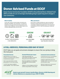 An ECCF Donor Advised Fund (DAF) offers unique benefits – to you and to your community. Simple and streamlined, a DAF allows you to support your favorite causes and organizations from one dedicated account. Gift cash, stocks or non-cash assets into your fund and receive an immediate tax deduction. ECCF manages your investment, which means that your ability to do good can grow over time. Whenever you’re ready to make a gift to any 501c3 organization – around the corner or around the world – it’s fast and easy from your donor portal.